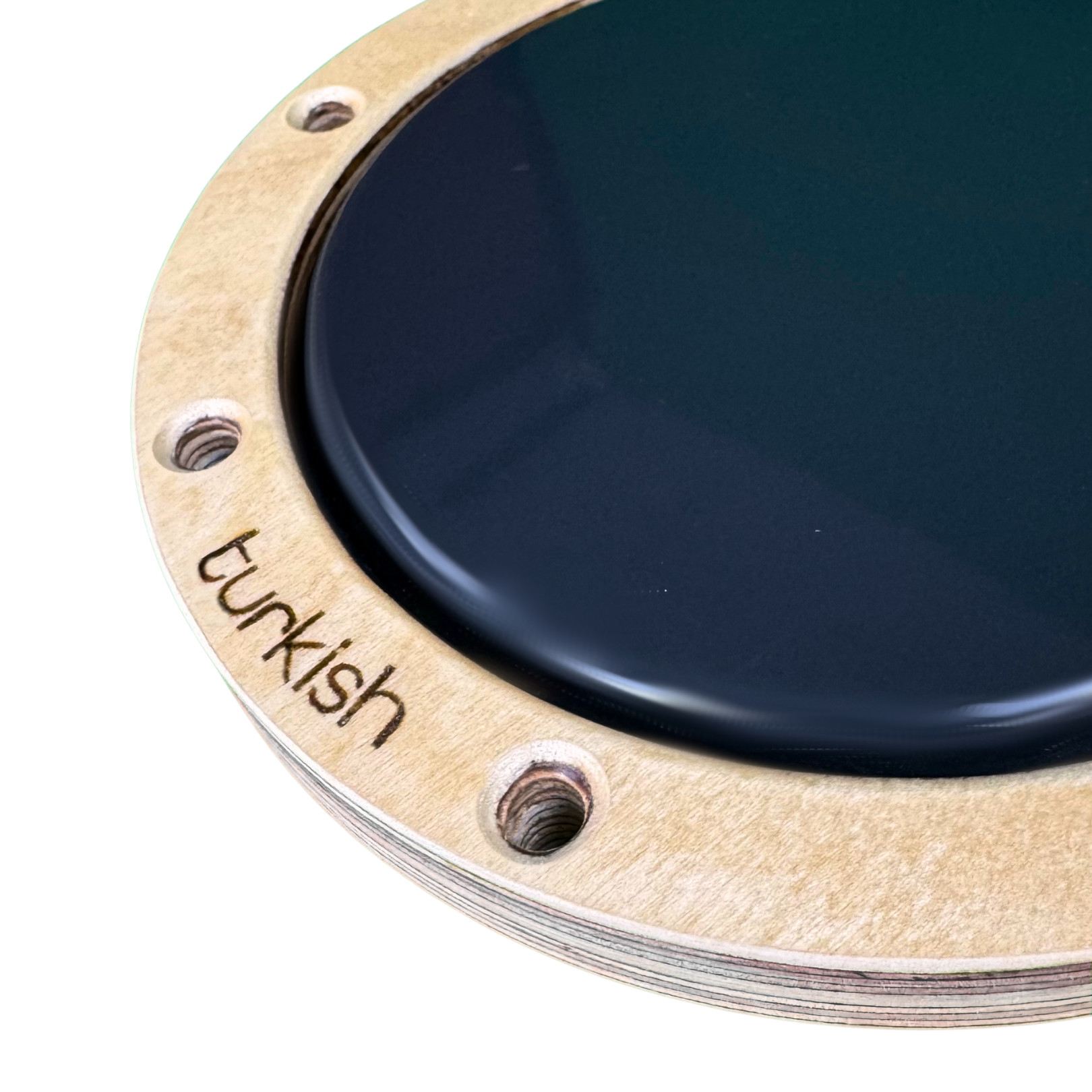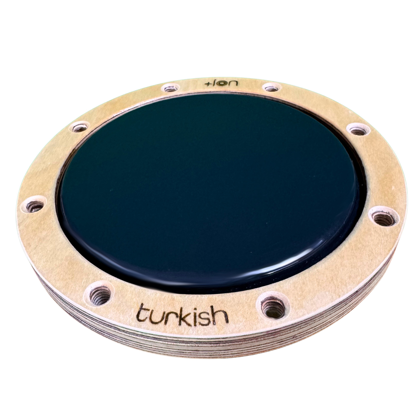 Rooted in the sounds of Turkish percussion, this drum head features a skin made from synthetic material in either a blue or green finish.This material is widely used in professional-level instruments these days due to the fact that it is unaffected by climatic conditions such as humidity, which results in a loss of tension.
